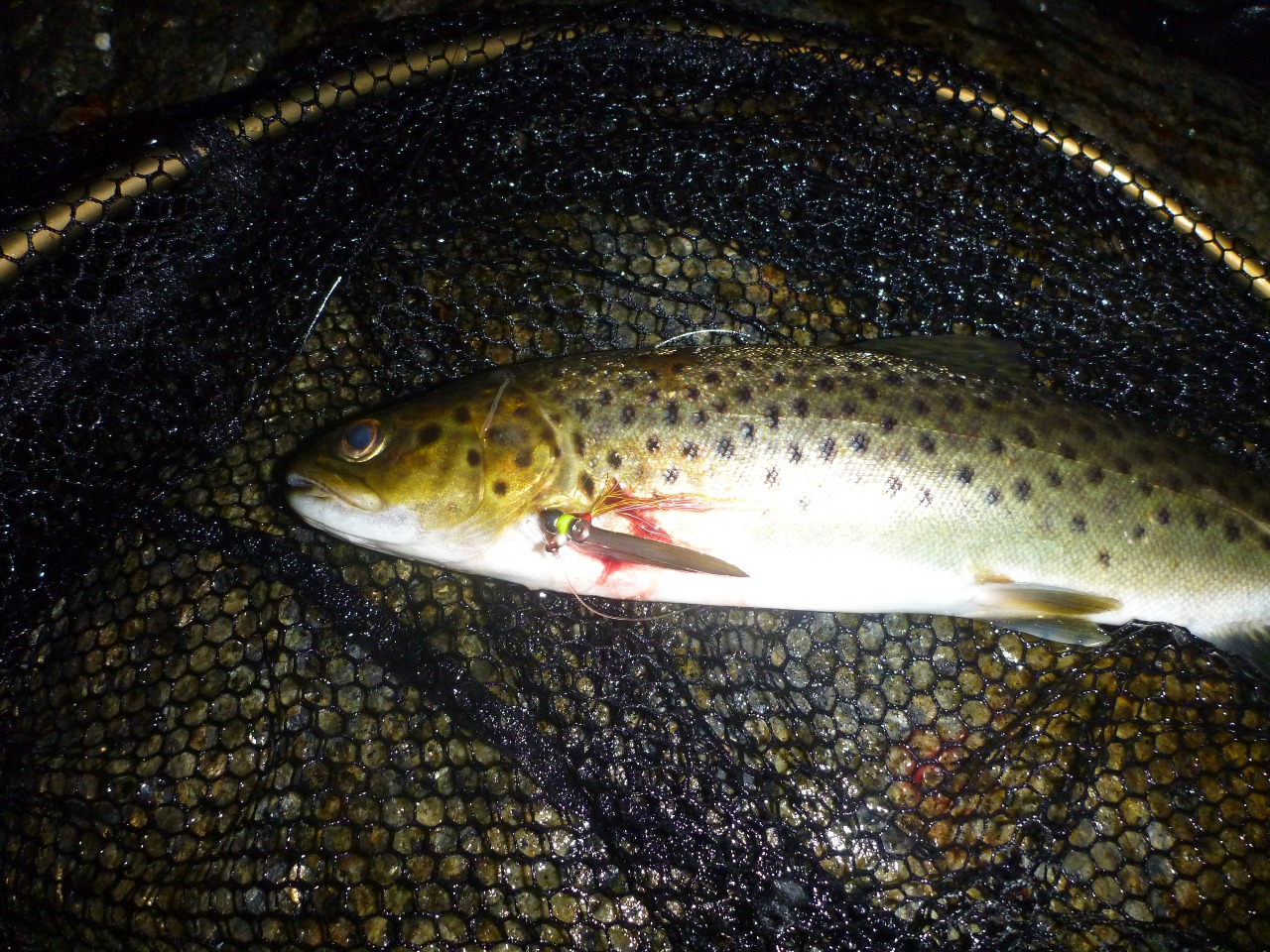 Bassenget vi fisket var helt vilt i et kvarter, Kristoffer hadde en med god størrelse på som han mistet da den svømte rett mot han. Ikke mange kast etter tok jeg en liten ørret, veldig torpedoformet fisk med god K-faktor så sent på sommeren.
